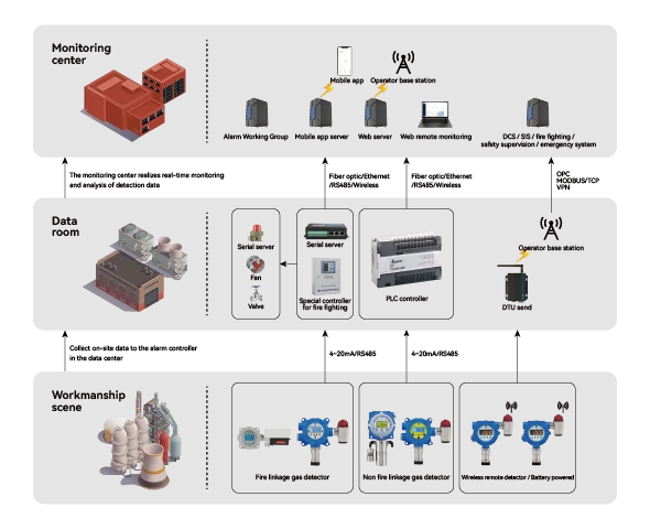 The GDS system employs high-performance gas detectors to accurately measure ambient gas concentrations, transmitting data to the host via standard signal, bus, wireless transmission, or industrial Ethernet.